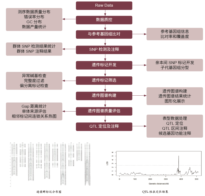 遗传图谱(Genetic linkage map)是指基因或DNA 分子标记在染色体上的相对位置与遗传距离,通常以基因或DNA 片段在染色体交换过程中的重组频率厘摩(cM) 表示。一般是对群体进行全基因组测序,利用生物信息学方法检测单核苷酸多态性位点(SNP),计算多态性标记间的遗传连锁距离,绘制高密度的遗传图谱。该方法可进行QTL 定位,加快功能基因的鉴定和验证的进度, 辅助基因组组装, 还可以提供基因组进化信息。