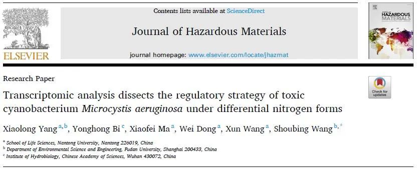 Yang X, Bi Y, Ma X, Dong W, Wang X, Wang S. Transcriptomic analysis dissects the regulatory strategy of toxic cyanobacterium Microcystis aeruginosa under differential nitrogen forms. J Hazard Mater. 2022 Apr 15;428:128276. doi: 10.1016/j.jhazmat.2022.128276. Epub 2022 Jan 13. PMID: 35051775.