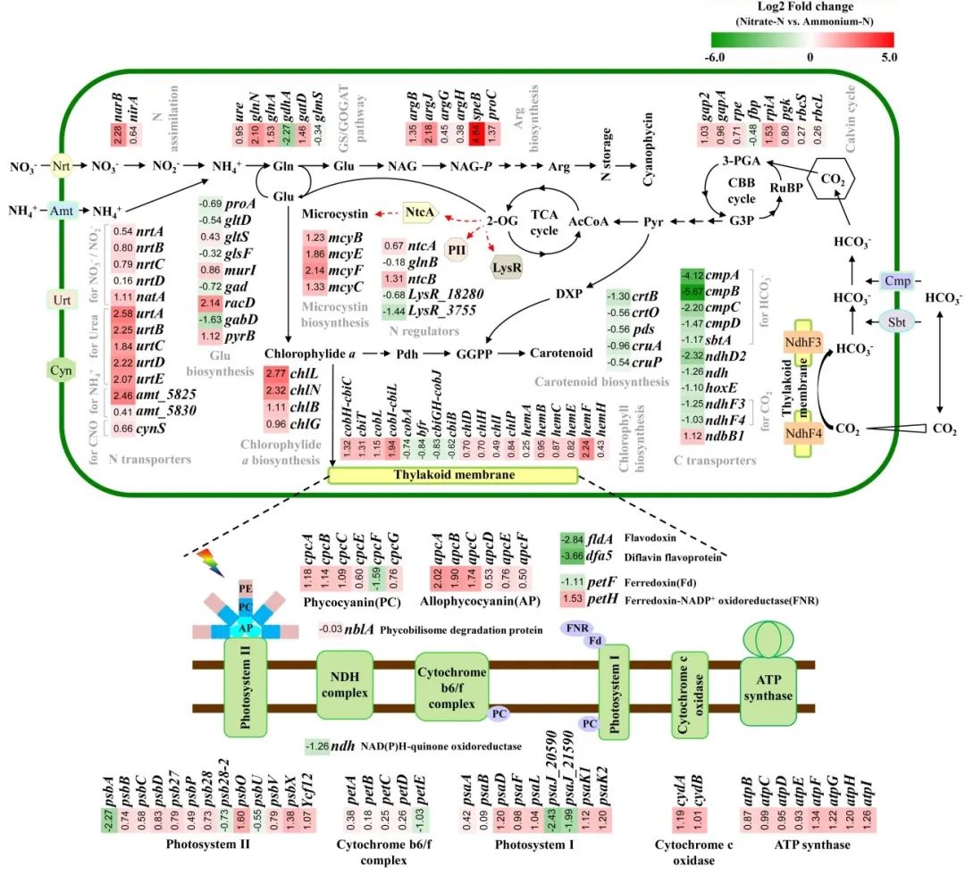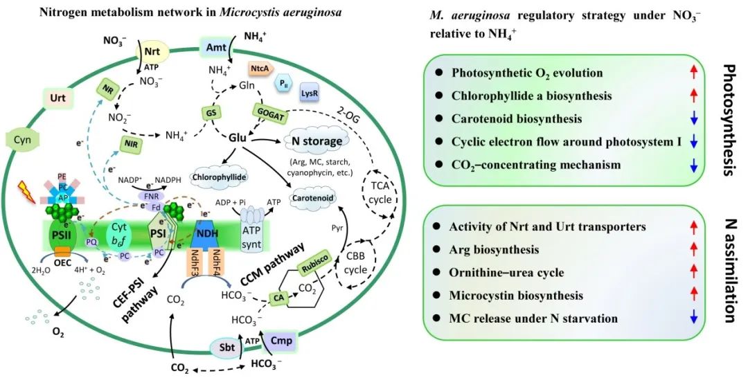 这项研究是首次将生理信息和转录组学反应结合起来,以探讨铜绿假单胞菌对氮形态的差异反应机制。与硝酸盐相比,铵在刺激氮限制型铜绿假单胞菌的初始生长方面表现更好,而由于过量铵供应造成的PSII损伤,藻类生长和光合作用降低。相比之下,充足的硝酸盐有利于更高的细胞密度和MC配额。硝酸盐培养的铜绿假单胞菌与铵培养的铜绿假单胞菌的基因转录组模式存在显著差异。共检测到765个基因在两种形式的供氮细胞之间差异表达,它们涉及光合能量传递、氮运输和储存、MC生物合成等的调节。特别是,与光能耗散相关的基因被显著上调,以维持高氨氮下细胞内的能量平衡,这为光合作用和氮代谢之间的相互作用提供了新的见解。然而,本研究的主要局限性在于许多新的srna无法在公共数据库中注释,这限制了对铜绿假单胞菌氮代谢和转录后调控机制的进一步研究。