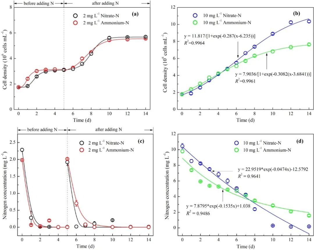注:培养2天后,所有2 mg-N/L组的氮含量均耗尽。为了进一步研究再次经历氮饥饿的铜绿假单胞菌对相同氮形态的生长反应,在第五天将这些组中的氮浓度重新调整为初始浓度。