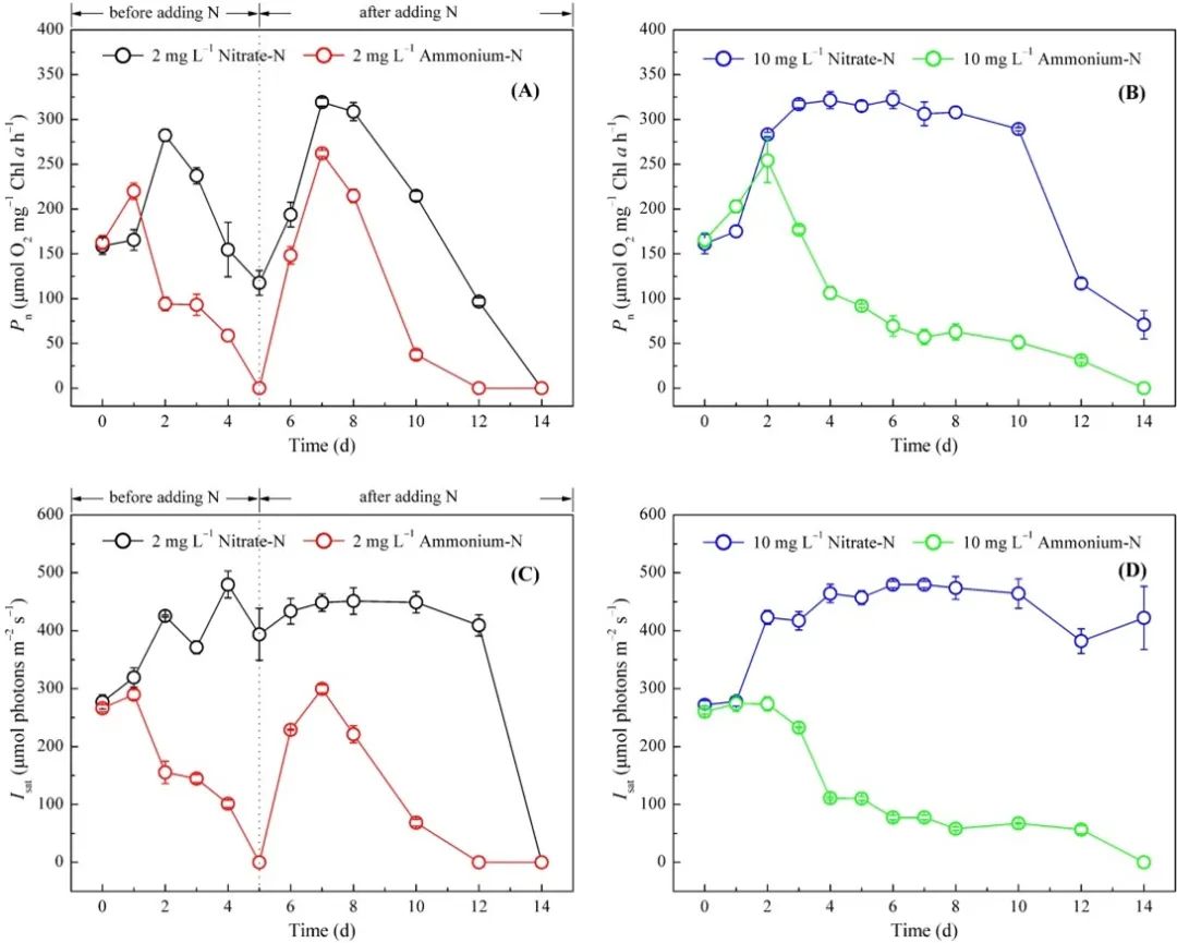 铜绿假单胞菌对铵供应的快速生长反应,培养一天后,所有铵组的净光合速率迅速增加,显著高于硝酸盐组。然而,在培养基中的氮含量耗尽后,2 mg/L氮处理组Pn值开始下降。这进一步强调了光合作用和氮代谢之间的密切关系。在10 mg-N/L组中,充足的硝酸盐供应确保了Pn的持续增加,之后由于氮耗尽,Pn降低。然而,氨氮处理的Pn在两天后急剧下降,一直低于初始值直到培养结束。这表明细胞周围过量的铵离子含量导致绿脓杆菌光合作用的下调。综合分析,将氧释放的减少可能归因于两个方面:一是由于过量的光能积累导致PSII的下调,另一个是通过与铵离子和水分子之间的OEC结合位点的竞争减少光驱动的水氧化。