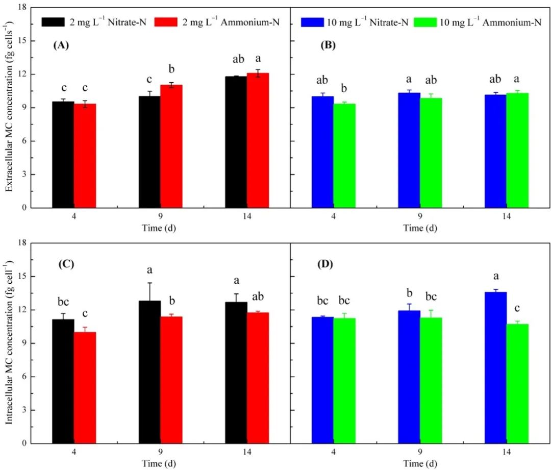 测定每个样本的MC产量,并将其计算为细胞配额值。结果表明硝酸盐培养有利于MC的生物合成,氮饥饿诱导毒素产生。当提供足够的氮时,硝酸盐下的MC总量在培养期间没有显著变化,但过量的铵会导致细胞内MC释放到环境中。