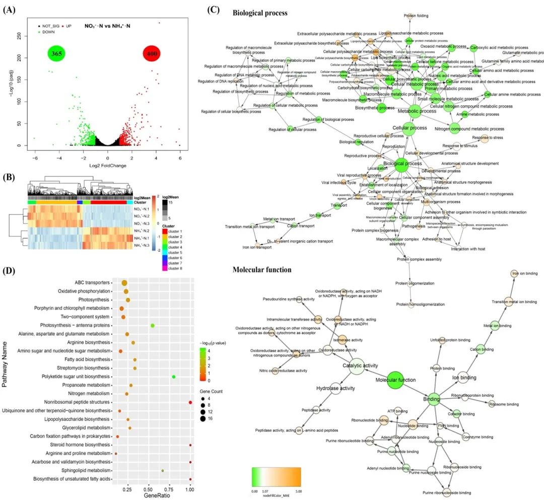 当环境中氮的浓度和形态随着营养条件的改变,细胞内氮代谢途径也相应改变。转录组分析结果表明,在硝酸盐培养的铜绿假单胞菌和氨氮培养的铜绿假单胞菌之间,超过14%的总基因表达存在显著差异。其中,400个基因上调,365个基因在硝酸盐条件下相对于铵态氮水平下调(图4A)。DEGs的层次聚类显示,具有类似功能或参与相同生物过程的基因聚集在同一组中,并且在组内的样本中观察到DEGs表达的重复性较好。