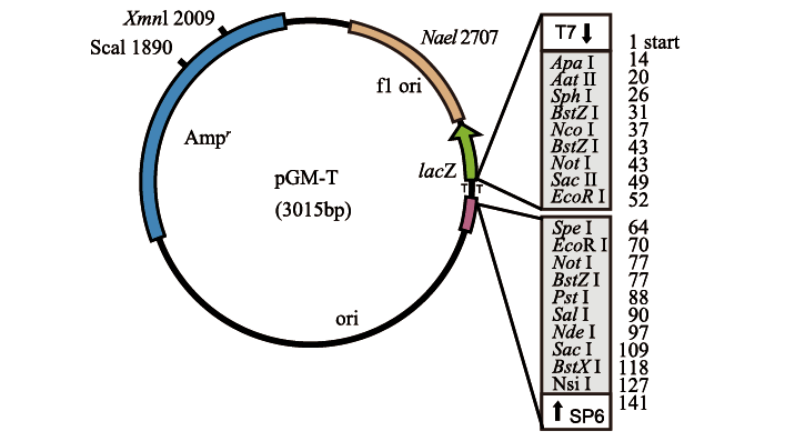 pGM-T是高效克隆 PCR 产物的专用载体,由克隆载体改建而成,使多克隆位点两侧的 3’端带 T。由于大部分耐热聚合酶反应时都会在 PCR产物的 3’端添加一个 A,可与 pGM-T 载体 3’端的T互补连接,同时 3’T突出端可以防止载体的自身环化,因此可大大提高PCR产物的连接和克隆效率。pGM-T载体包含有T7和SP6 RNA聚合酶启动子,其侧端和多克隆位点区相接,多克隆位点区位于β半乳糖苷酶的α肽编码区内。α肽插入失活使得菌落在指示培养基中呈现不同颜色,可根据颜色直接筛选重组克隆,白色克隆为阳性重组克隆,蓝色的为载体自连的克隆 (具体筛选原理见分子克隆第三版)。