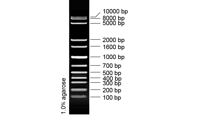1 kb Plus DNA Ladder 是由单独制备的 PCR 产物混合而成,共有 12 条 DNA 片段,已加入上样缓冲液,可直接电泳,每次上样 6 µl,为便于电泳后观察, 1000 bp 条带最亮,每次用量约为 100 ng,其它条带的 DNA 每次用量约为 50 ng。
