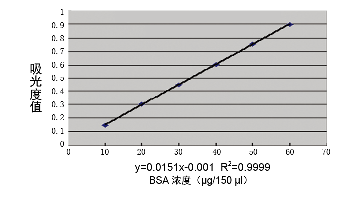 ■ 灵敏准确:测定范围是 50-1000 μg/ml(595 nm 读数),可检测 25 μg/ml 的蛋白质,在测定范围内有较好的线性关系,变异系数小。