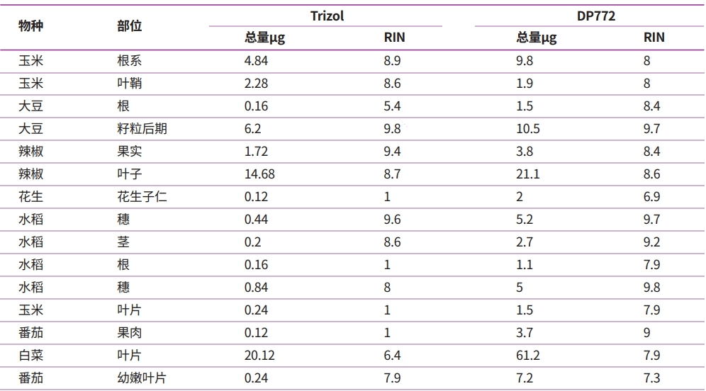 本试剂盒可从植物组织,特别是富含多糖多酚或淀粉的植物组织(如棉花叶片,成熟水稻叶片,拟南芥种子,白松松针,香蕉,枇杷叶片,马铃薯块茎,苹果,梨,西瓜果肉,猕猴桃,月季,烟草,沙棘,百合等)中提取总RNA。