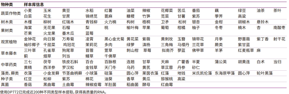• 通用性强: 经实验验证植物种类超过160种,覆盖大部分样本类型。